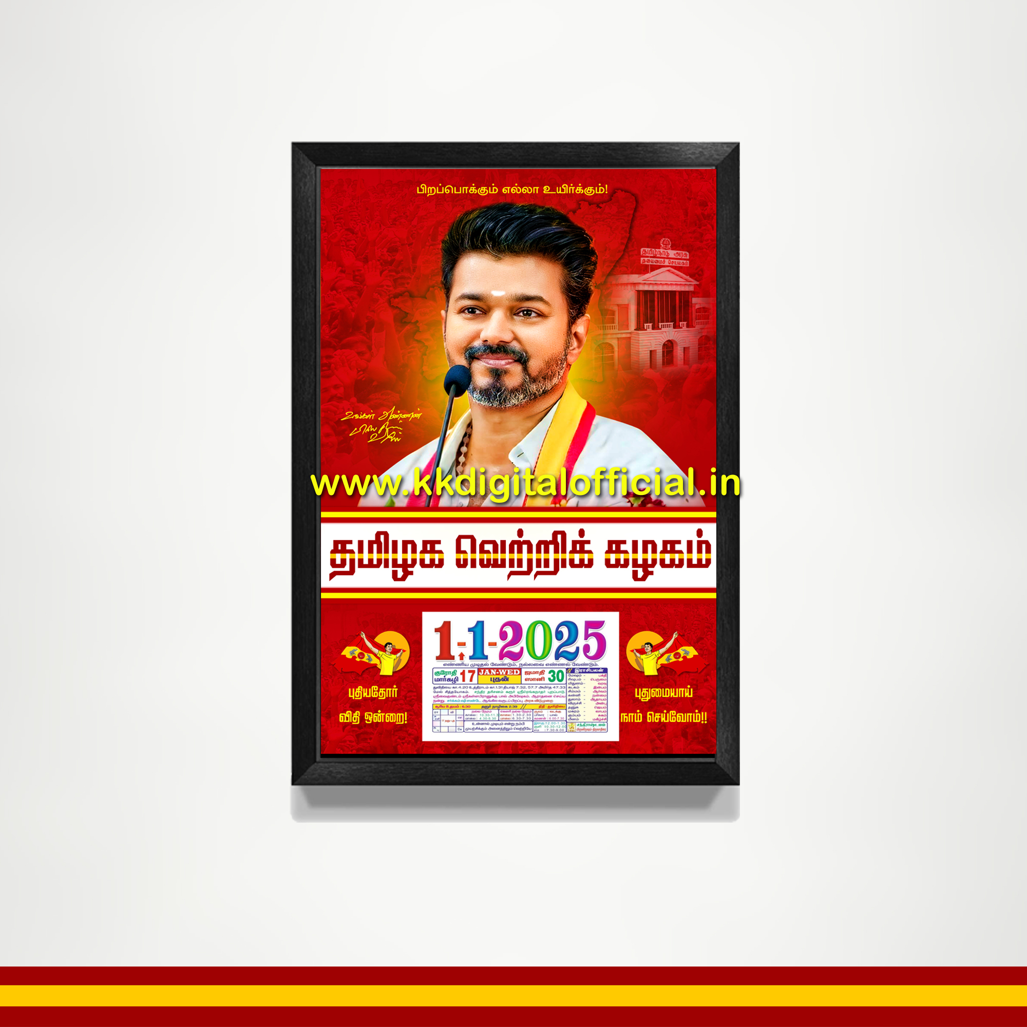 Celebrate Tamil pride and showcase your support for Tamilaga Vettri Kazhagam (TVK) with this beautifully designed wall calendar. Featuring stunning visuals of Tamil Nadu’s rich culture, heritage, and the party’s iconic symbols, this calendar is a perfect blend of art and inspiration. Each month highlights TVK’s vision for progress, transparency, and Tamil empowerment, making it a meaningful addition to your home, office, or workspace.